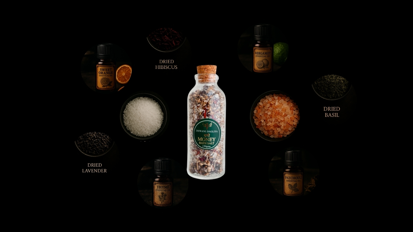 ● Add 2-3 table spoons of Dhani Money Bath Salt to warm water and soak for 15-20 minutes, visualizing negative energy re;easing and prosperity flowing in.
